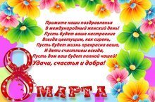 Примите самые искренние поздравления с чудесным весенним праздником- Международным женским днем 8 марта Пусть сбываются все ваши надежды и мечты, пусть каждый ваш день будет озарен счастливой улыбкой, а вместе с ароматом весенних цветов в вашу жизнь войдут радость и благополучие! Желаем вам доброго здоровья, любви, поддержки близких. Пусть взаимопонимание и согласие, спокойствие и радость всегда сопутсвует вам!