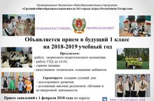 С 1 февраля начинается прием заявлений в 1 класс 2018-2019 уч. года детей, проживающих на территории, за которой закреплена школа согласно постановлению ИК АМР РТ от 22.12.2017 г. №589 "О закреплении территории"