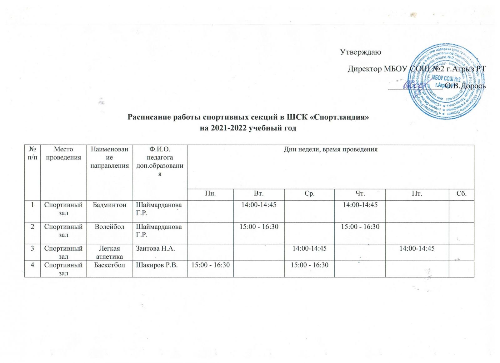 Расписание работы спортивных секций на 2021-2022