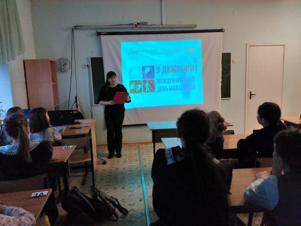 В целях воспитания нравственных чувств и качеств, формирования уважительного отношения к людям с ограниченными возможностями, в 5 "а" классе 9 декбря 2019 года проведен классный час, посвящённый Международному дню инвалидов.