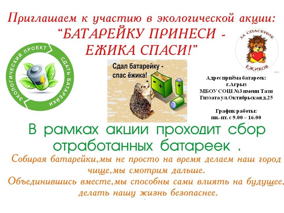 С ростом населения и промышленности экологические проблемы на Земле становятся все более актуальными. Нам не все равно, что будет с нашей планетой, когда вырастут наши дети. Поэтому в нашей школе проходит экологическая акция "Батарейку принеси-ёжика спаси!" О том, что батарейки вредны для окружающей среды, слышал почти каждый. Но многие не знают, как правильно поступить с использованными батарейками.