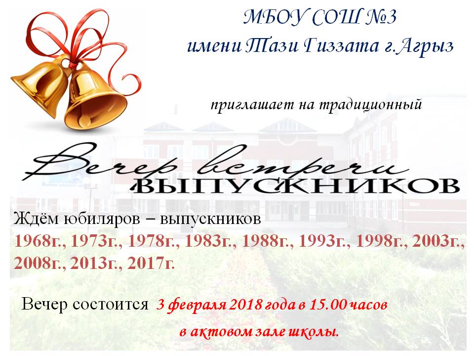 Вечер состоится 3 февраля 2018 года в 15.00 часов в актовом зале школы.