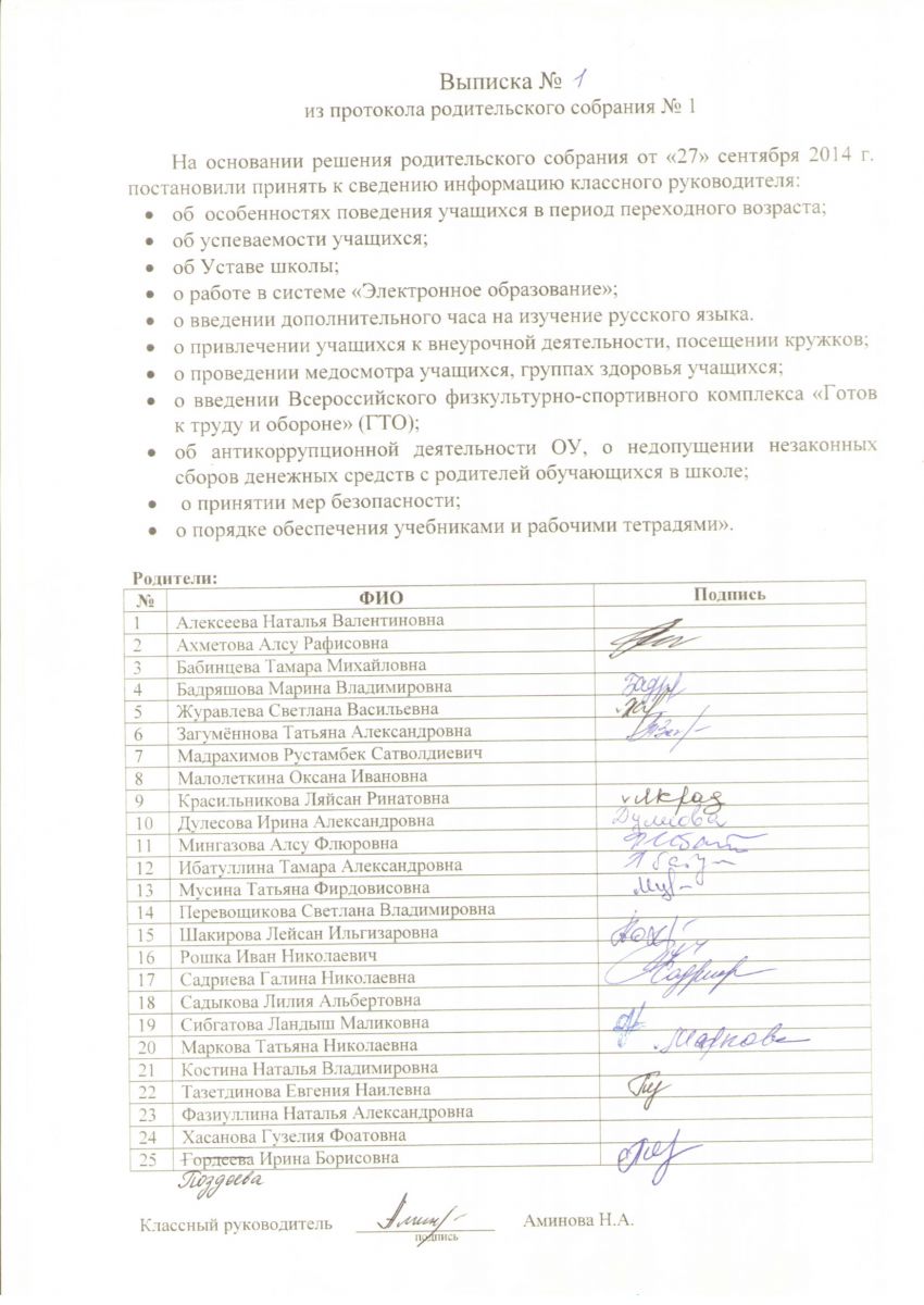 Выписка из протокола родительского собрания в 7б классе. Классный руководитель Аминова Н.А.