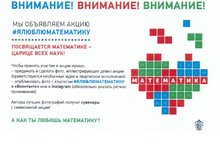 С целью популяризации математики Минобрнауки России с 30.11.15 по 30.12.15 запускает Всероссийскую акцию "Я люблю математику". Акция рассчитана на школьников и студентов и будет проходить на двух площадках социальных сетей: "Вконтакте" и "Instagram". Чтобы принять участие в интерактивном проекте, необходимо сделать фото, иллюстрирующее девиз акции "Я люблю математику", сопроводить его коротким текстом с указанием ФИО и номером учебного заведения (обязательно указать регион проживания), а потом опубликовать работу в социальных сетях с хэштегом #ялюблюматематику. Авторы самых лучших фотографий получат сувенирные призы с символикой акции.