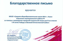 Ученик 10 класса нашей школы получили благодарственное письмо за помощь в проведении городской социальной акции для 8-х классов "70-летие Победы в Великой отечественной войне" от организаторов республиканского проекта "Кадровый резерв"