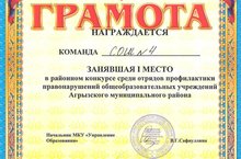 Команда нашей школы заняла 1 место в районном конкурсе среди отрядов профилактики правонарушений общеобразовательных учреждений Агрызского муниципального района. Молодцы!!!