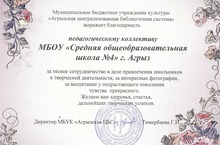 Агрызская централизованная библиотечная система выражает благодарность нашей школе за тесное сотрудничество в деле привлечения школьников к творческой деятельности, за интересные фотографии, за воспитание у подрастающего поколения чувства прекрасного.