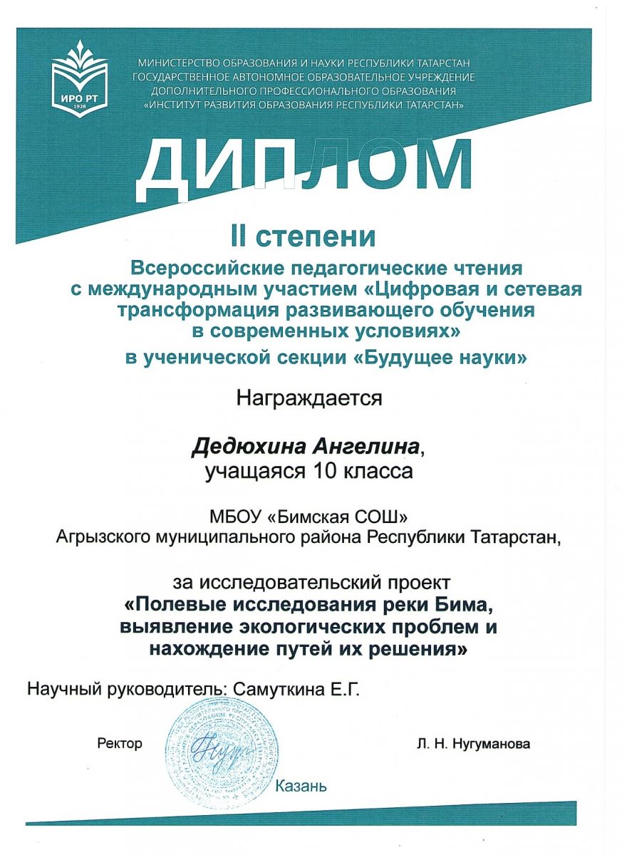 Опубликовано: 22.12.2021Учащиеся Бимской школы приняли участие в ученической секции во Всероссийских пед чтениях с международным участием "Цифровая и сетевая трансформация развивающего обучения в современных условиях" и стали призёрами. Подготовили девушек учителя Самуткина Е. Г. и Юзыкаева Л.З