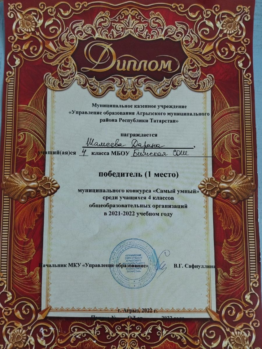 Опубликовано: 25.03.2022Сегодня в гимназии №1 г.Агрыз проведен муниципальный конкурс "Самый умный" среди учащихся 4 классов школ района. В конкурсе приняла участие победитель школьного тура Шамеева Дарина. В районе она стала Победителем. Поздравляем Дарину, Пусть в жизни будут много таких Побед!