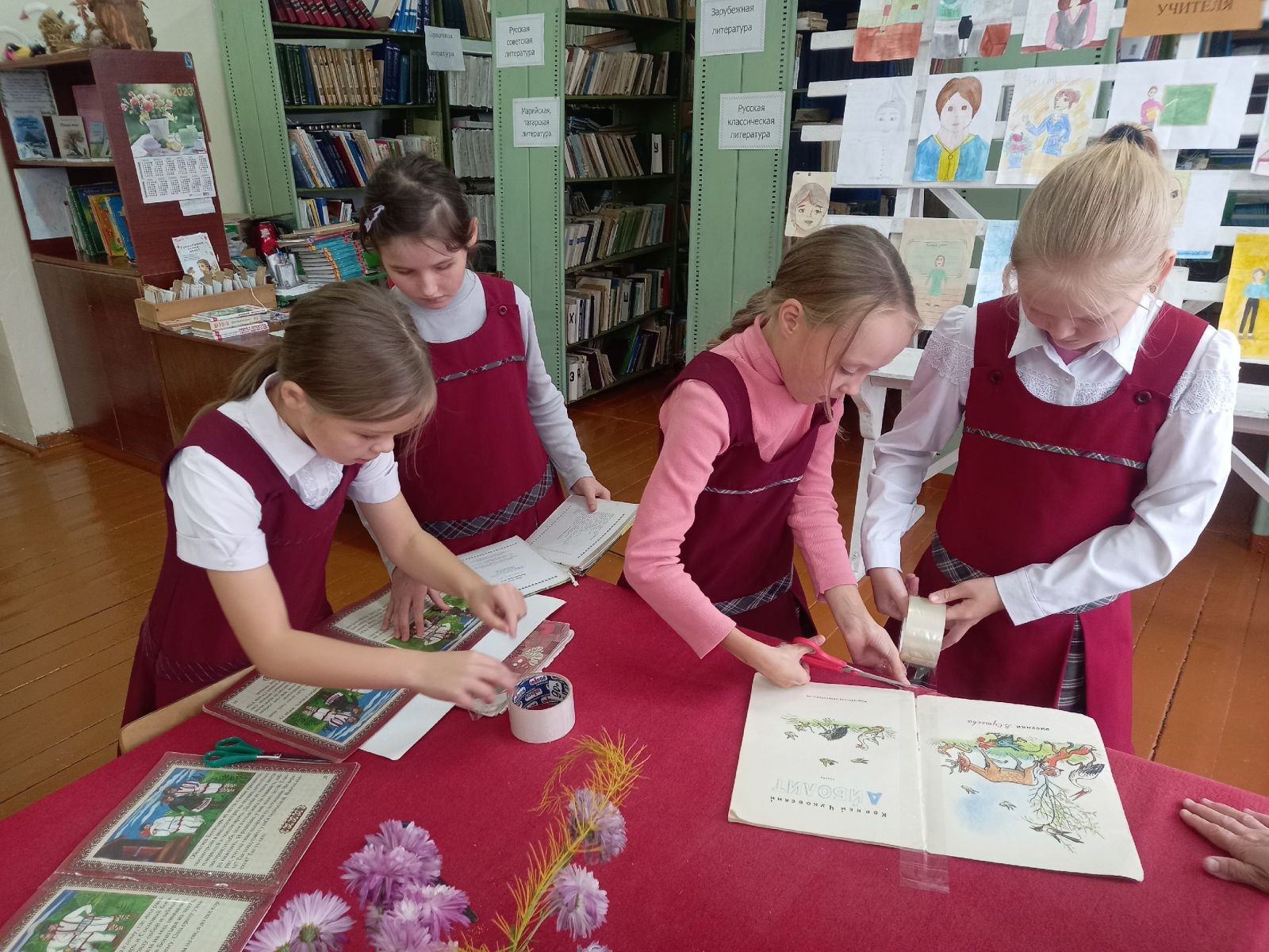 Опубликовано: 24.10.2023 В Международный день школьных библиотек в Бимской школе учащиеся участвовали в различных акциях: в библиотеке помогли отремонтировать потрёпанные книги, оформили книжки-малышки и плакаты.