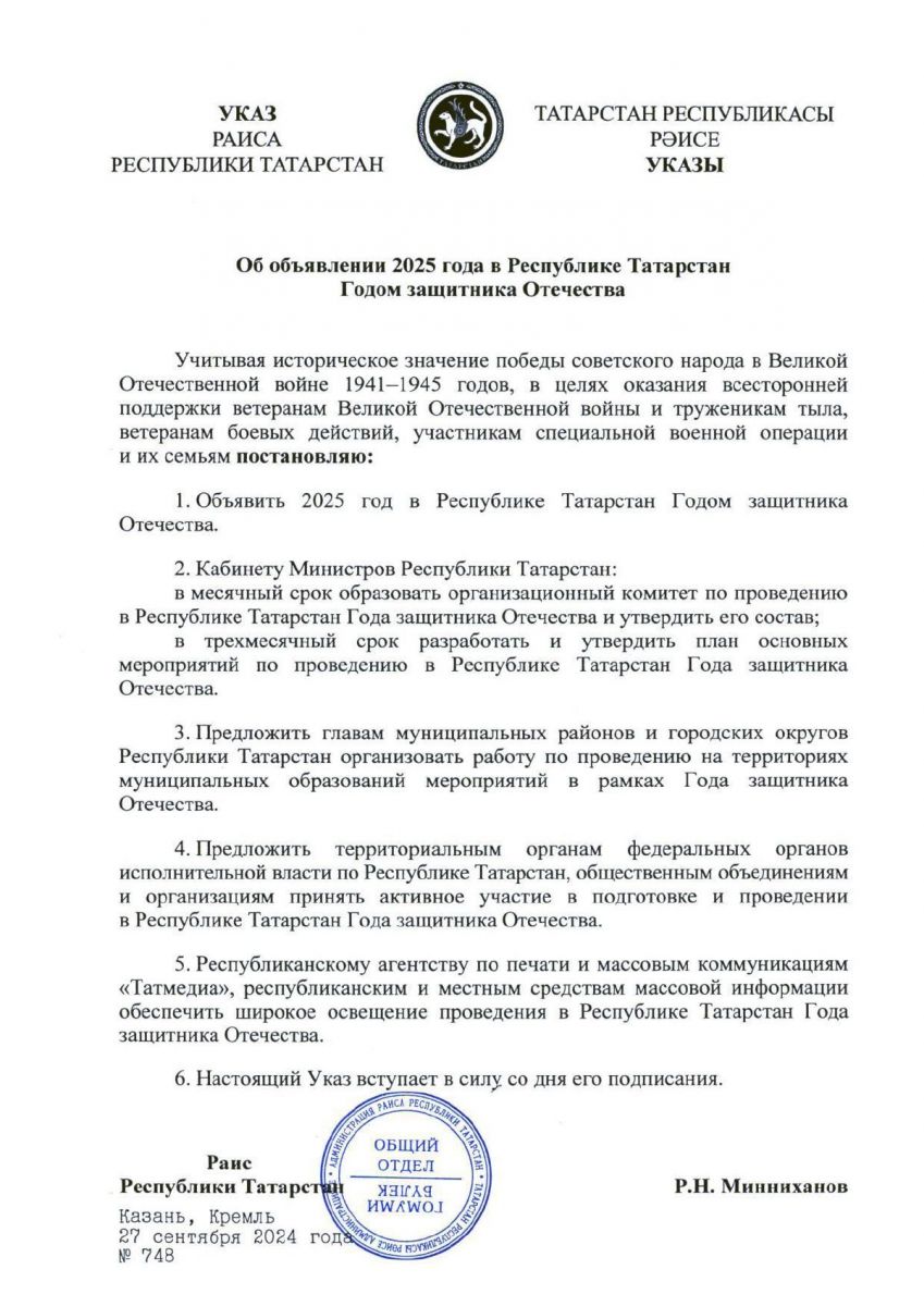 № 748 | Указ Раиса Республики Татарстан "Об объявлении 2025 года в Республике Татарстан Годом защитника Отечества"