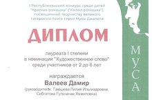 Поздравляем наших воспитанников с Дипломами лауреата 1 степени Республиканского конкурса среди детей "Красная ромашка", посвященный творчеству великого татарского поэта-героя Мусы Джалиля Валеева Дамира, Сибгатову Аиду в номинации "Художетсвенное слово"