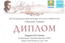 Наши воспитанники активные участники конкурсов. Поздравляем Байрамову Аишу, Александрову Дарью, Сибгатову Аиду с замечательными результатами - дипломы лауреата 2 степени в Республиканском конкурсе детского творчества "Читаем Тукая". Молодцы! Благодарим воспитателей за подготовку участников.