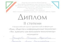 Наши педагоги Башарова С.Я. и Таюшева Л.И. приняли участие во Всероссийской научно-практической конференции "Язык, общество и информационные технологии". Удостоились диплома 2 степени за пособие "Сундучок знаний"