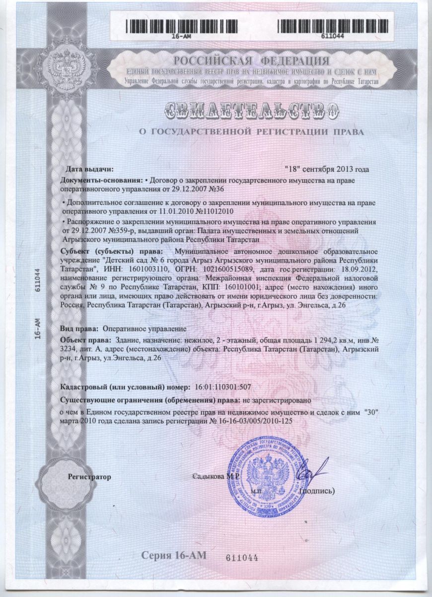6. Свидетельство о регистрации права на оперативное управление зданием