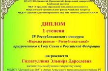 Воспитатель по обучению татарскому языку Гиззатуллина Эльвира Дарселевна приняла участие в IV Республиканском конкурсе "Народы разные - Республика одна!"приуроченного к Году Семьи в Российской Федерации в номинации "Каждый талантлив по- своему" и награждена дипломом 1 степени.
