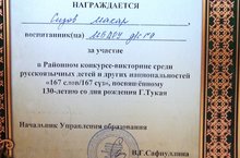 Наш воспитанник подготовительной группы №9 Сизов Макар принял активное участие в данном конкурсе и был награжден грамотой. Выражаем благодарность Макару и воспитателям по обучению детей татарскому языку - Ахметзяновой Р.Р. и Хисматуллиной Р.Р. за подготовку и участие в данном мероприятии.
