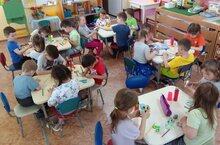 Утро в группе началось с беседы о пчелках. Дети вместе с воспитателем рассмотрели строение насекомых, узнали, как пчелы делают мед и где живут. С большим старанием ребята выполнили аппликацию «Пчелка на лугу" тем самым закрепили знания и представление о роли, которой играют пчёлы при опылении и получении мёда. -