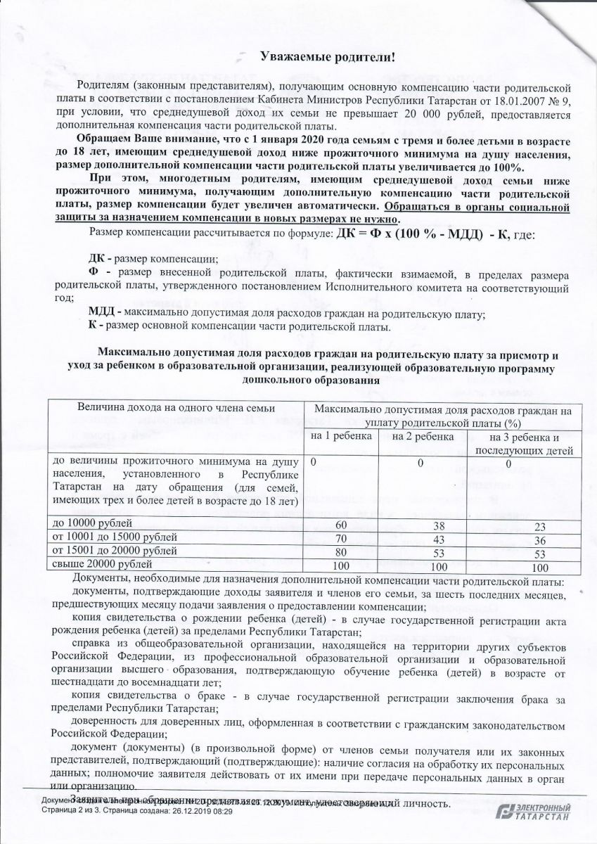 Обращаем Ваше внимание, что с 1 января 2020 года семьям с тремя и более детьми в возрасте до 18 лет, имеющим среднедушевой доход ниже прожиточного минимума на душу насаления, размер дополнительной компенсации части родительской платы увеличивается до 100%.