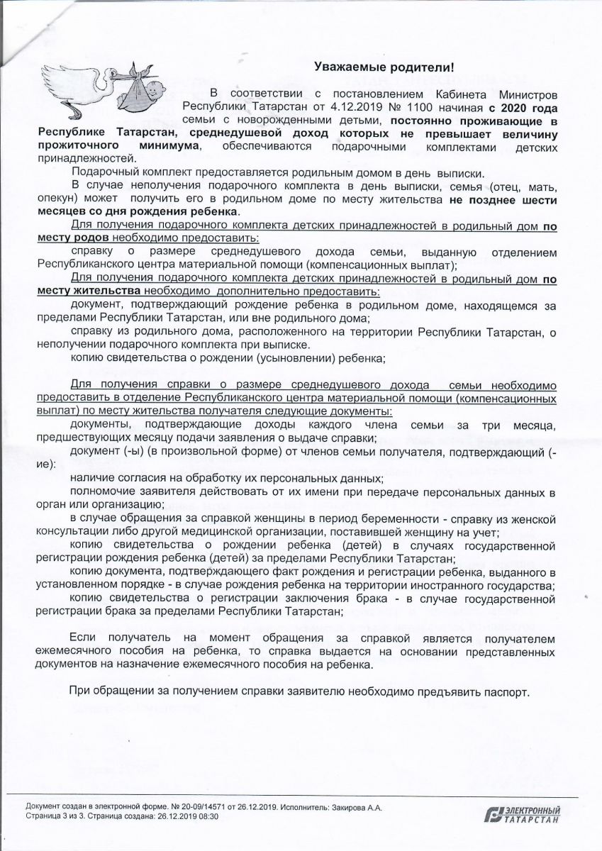 В соответствии с постановлением Кабинета Министров РТ от 4.12.2019 № 110 начиная с 2020 года семьи с новорожденными детьми, постоянно проживающие в РТ, среднедушевой доход которых не превышает величину прожиточного прожиточного минимума, обеспечиваются подарочными комплектами детских принадлежностей. Полностью ознакомиться можно здесь