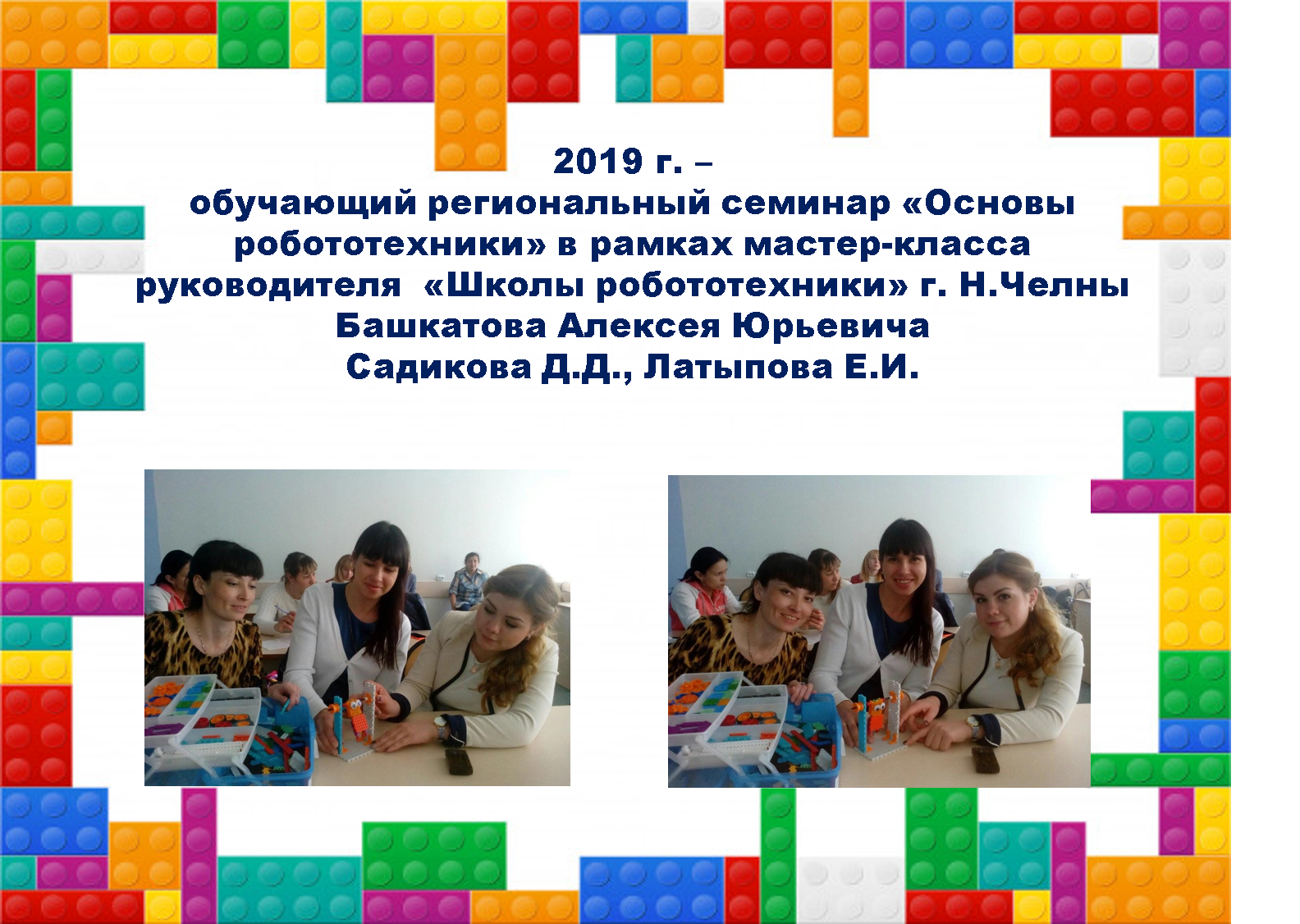 - 2019 г. – обучающий региональный семинар «Основы робототехники» в рамках мастер-класса руководителя «Школы робототехники» г. Н.Челны Башкатова Алексея Юрьевича (Садикова Д.Д., Латыпова Е.И.)