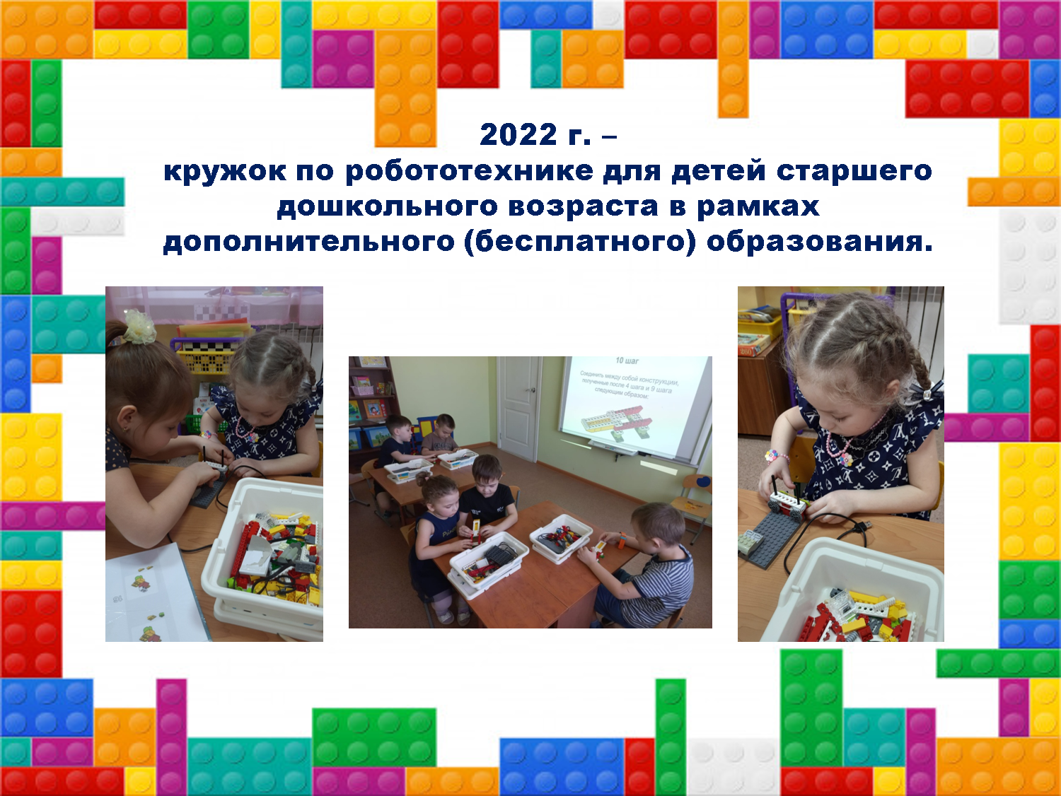 - 2022 г. – кружок по робототехнике для детей старшего дошкольного возраста в рамках дополнительного (бесплатного) образования