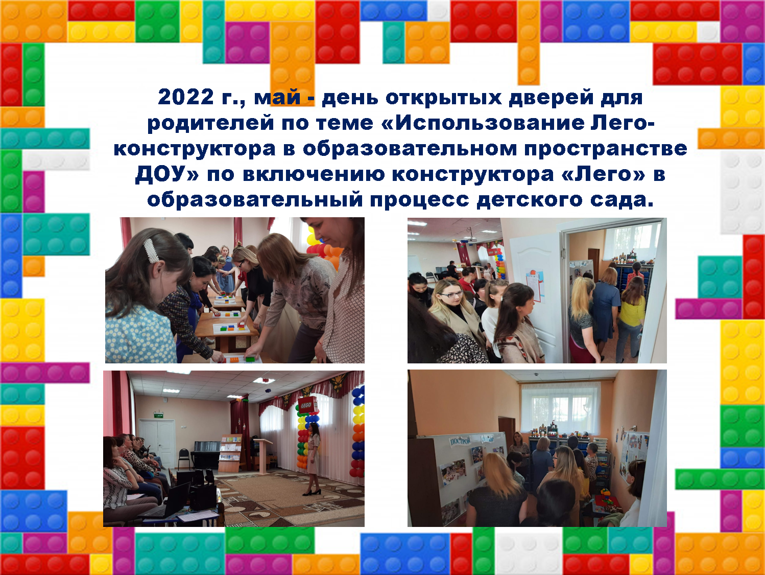 - 2022 г., май - день открытых дверей для родителей по теме «Использование Лего-конструктора в образовательном пространстве ДОУ» по включению конструктора «Лего» в образовательный процесс детского сада