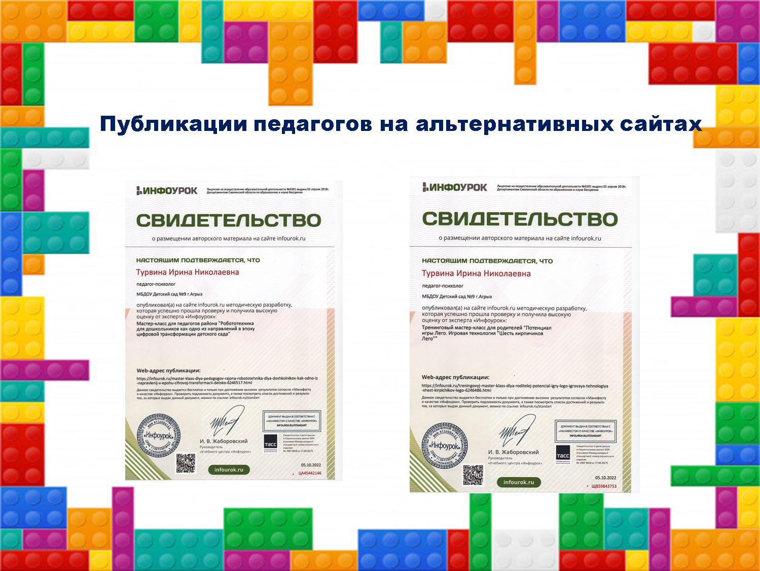 - 2022 г., апрель - Семинар "Использование ЛЕГО-конструктора в образовательном пространстве ДОУ по включению конструктора ЛЕГО в образовательный процесс детского сада