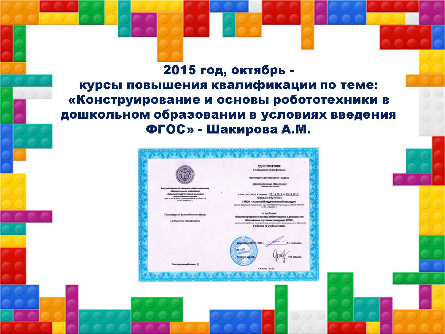 - 2015 год, октябрь - курсы повышения квалификации по теме: «Конструирование и основы робототехники в дошкольном образовании в условиях введения ФГОС» - Шакирова А.М.