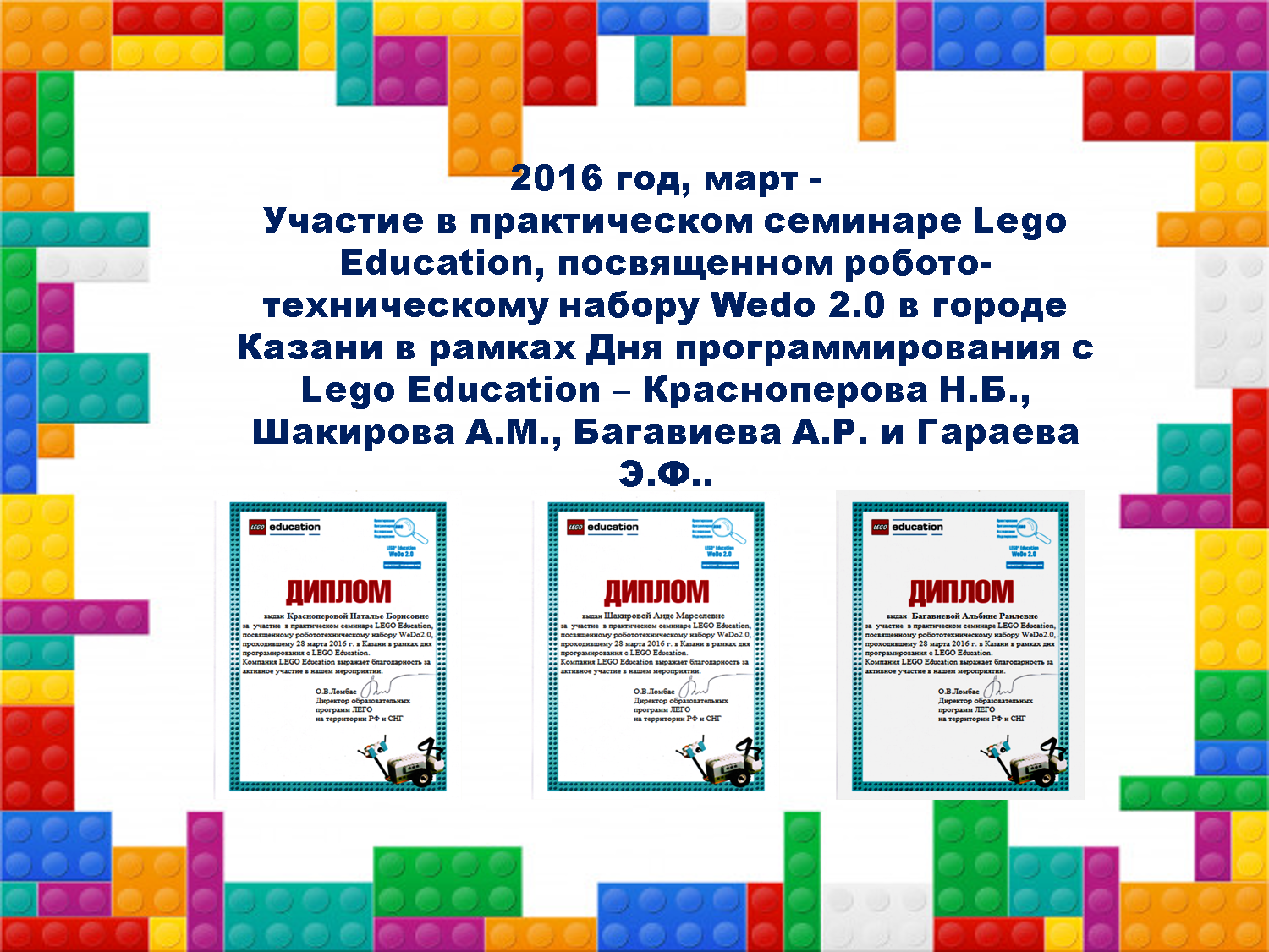 - 2016 год, март - Участие в практическом семинаре Lego Education, посвященном робото-техническому набору Wedo 2.0 в городе Казани в рамках Дня программирования с Lego Education – Красноперова Н.Б., Шакирова А.М., Багавиева А.Р. и Гараева Э.Ф.