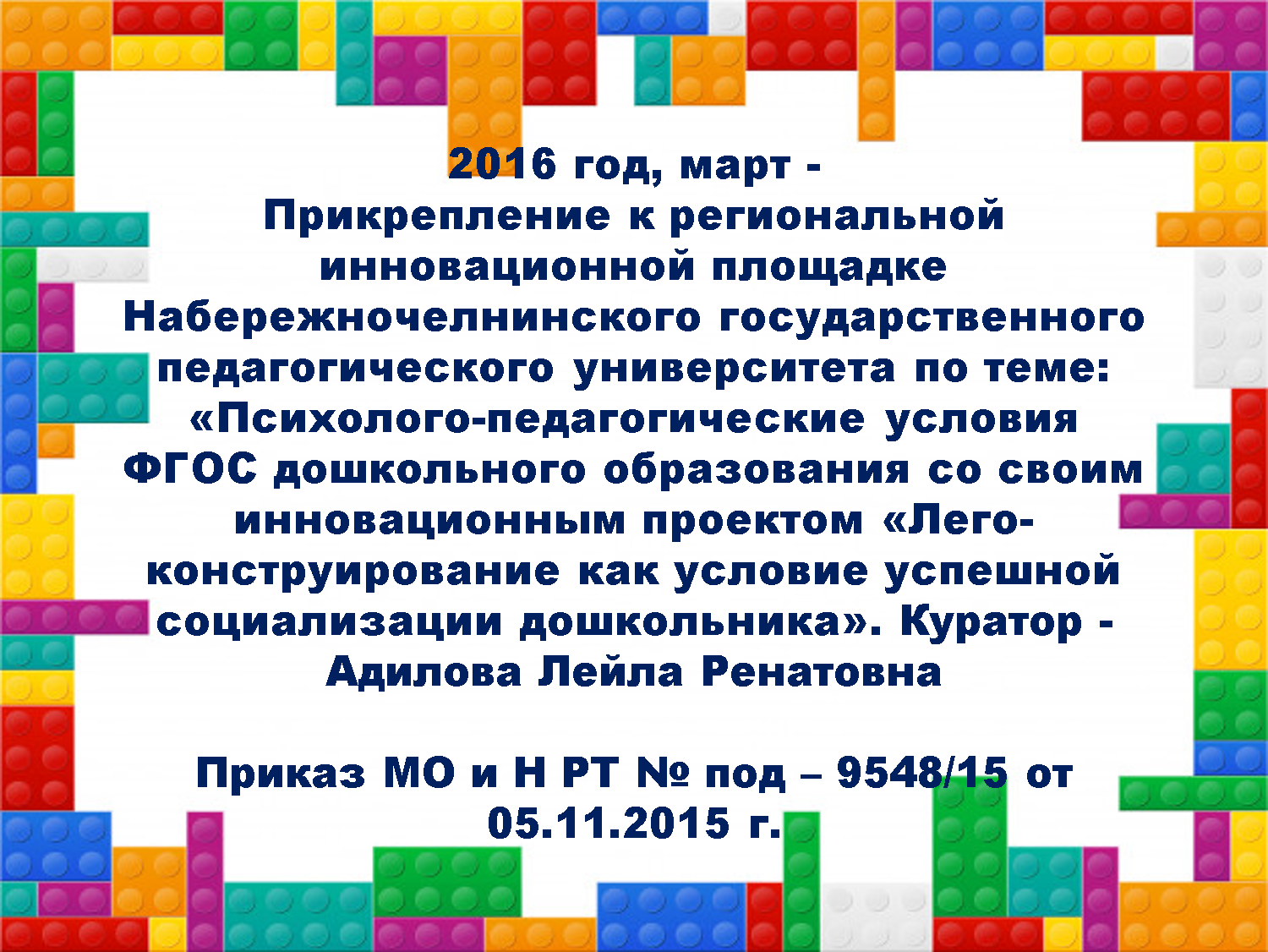 - 2016 год, март - Прикрепление к региональной инновационной площадке Набережночелнинского государственного педагогического университета по теме: «Психолого-педагогические условия ФГОС дошкольного образования со своим инновационным проектом «Лего-конструирование как условие успешной социализации дошкольника». Куратор - Адилова Лейла Ренатовна