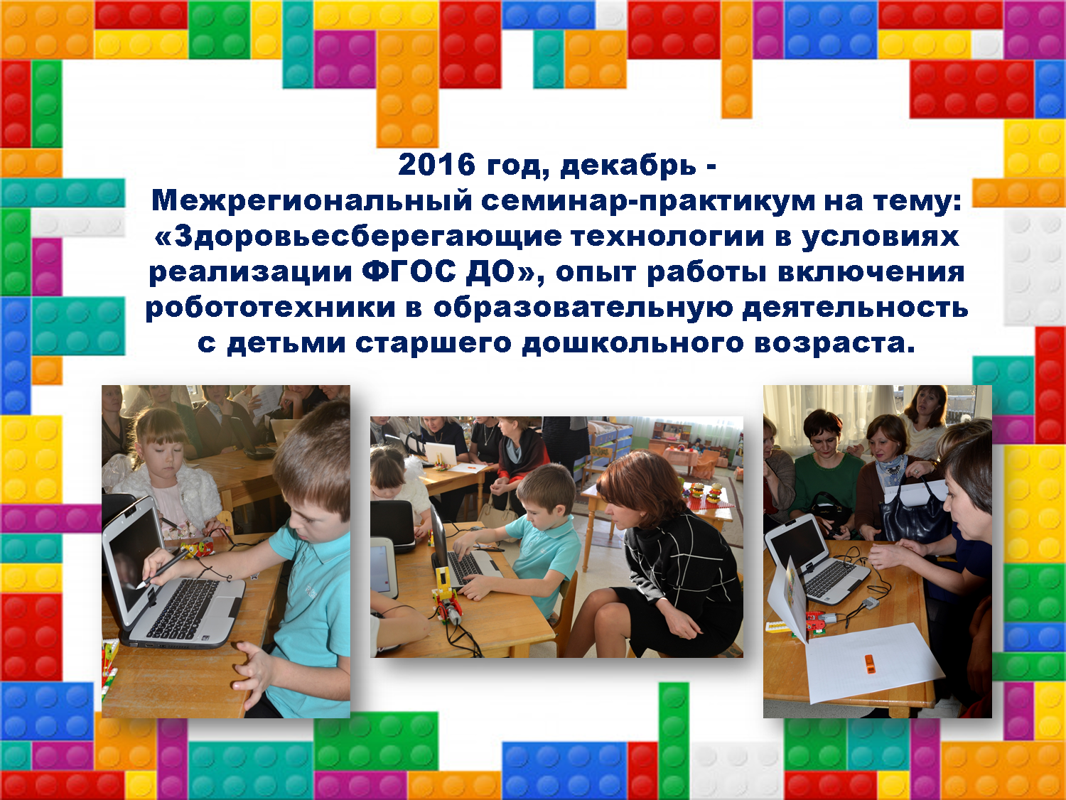 - 2016 год, декабрь - Межрегиональный семинар-практикум на тему: «Здоровьесберегающие технологии в условиях реализации ФГОС ДО», опыт работы включения робототехники в образовательную деятельность с детьми старшего дошкольного возраста.