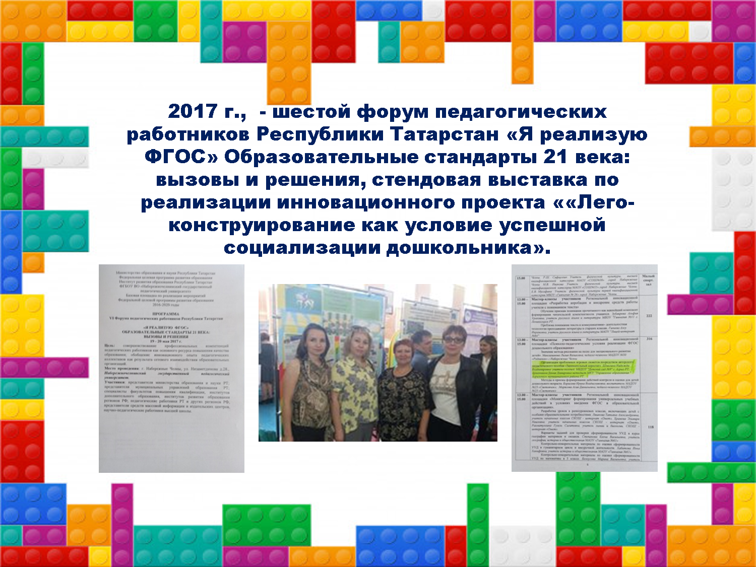 - 2017 г - шестой форум педагогических работников Республики Татарстан «Я реализую ФГОС» Образовательные стандарты 21 века: вызовы и решения, стендовая выставка по реализации инновационного проекта ««Лего-конструирование как условие успешной социализации дошкольника»