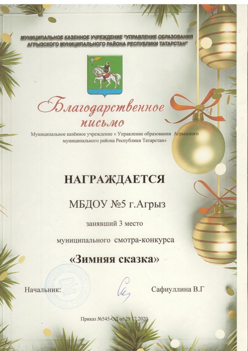 Благодарственное письмо МКУ , за 3 место в муниципальном смотре - конкурсе "Зимняя сказка", 2020 г.