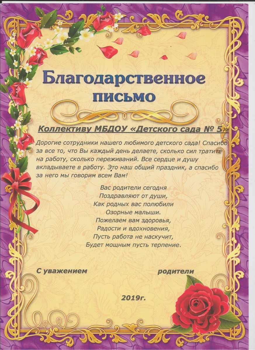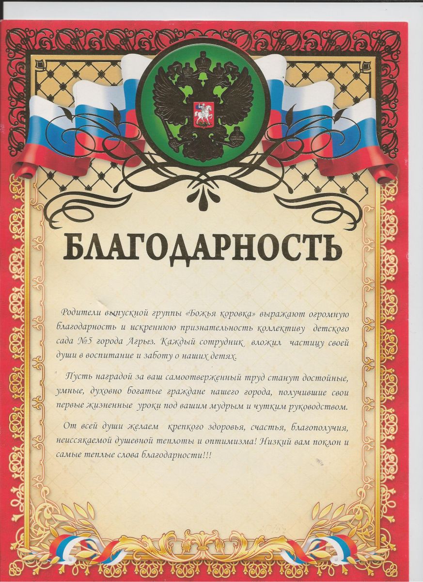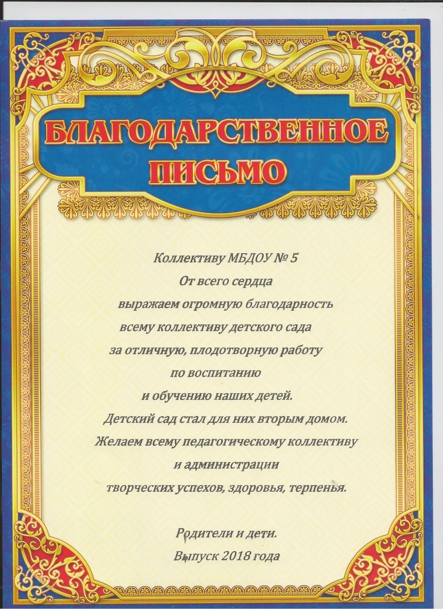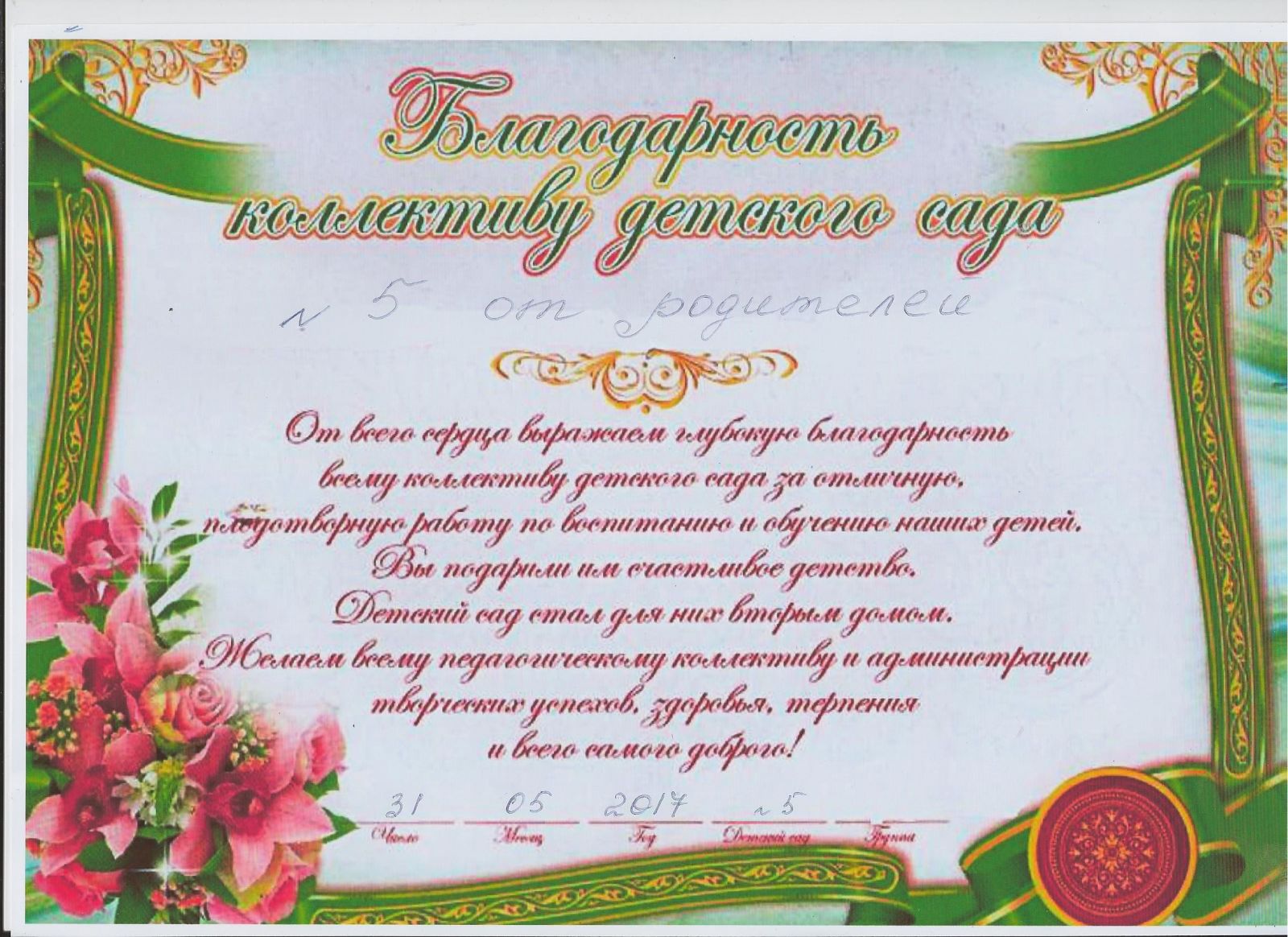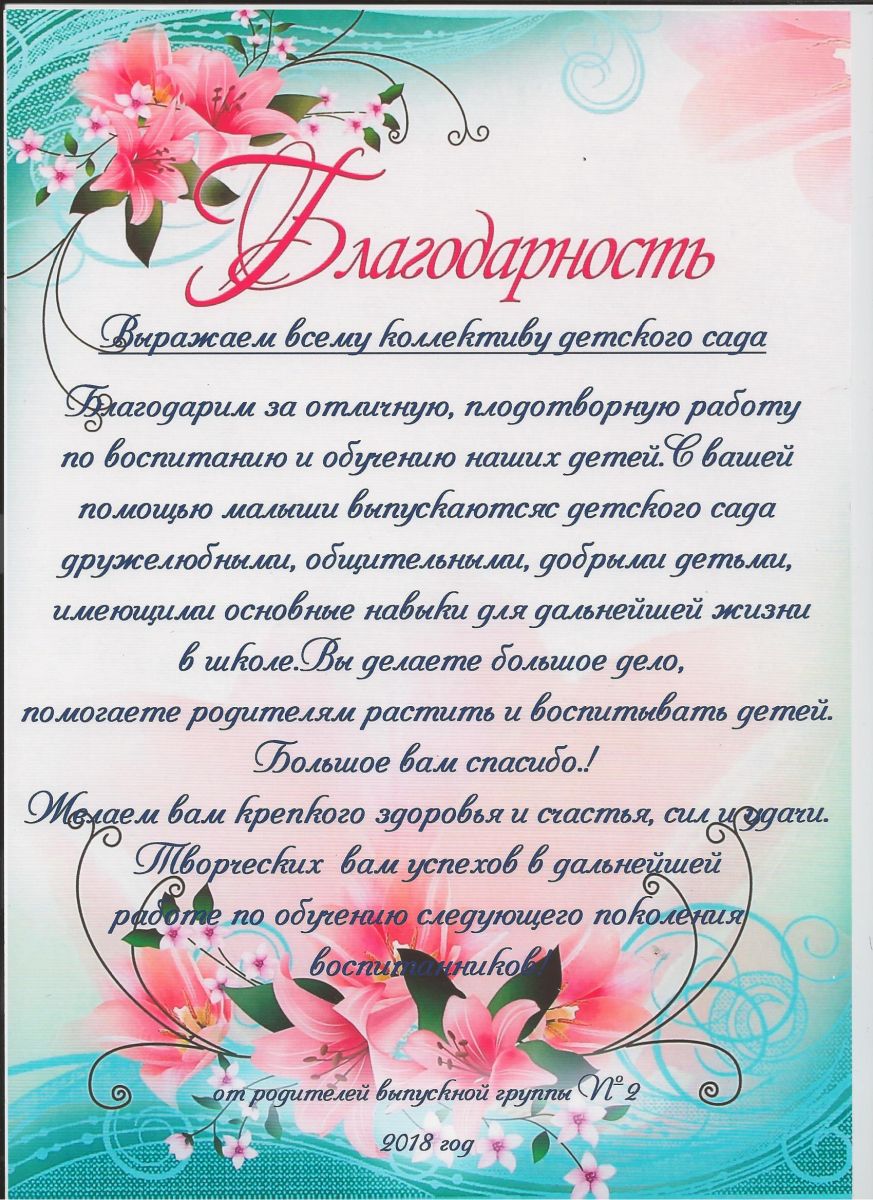 Благодарность от родителей подготовительной группы №2, 2018 год.
