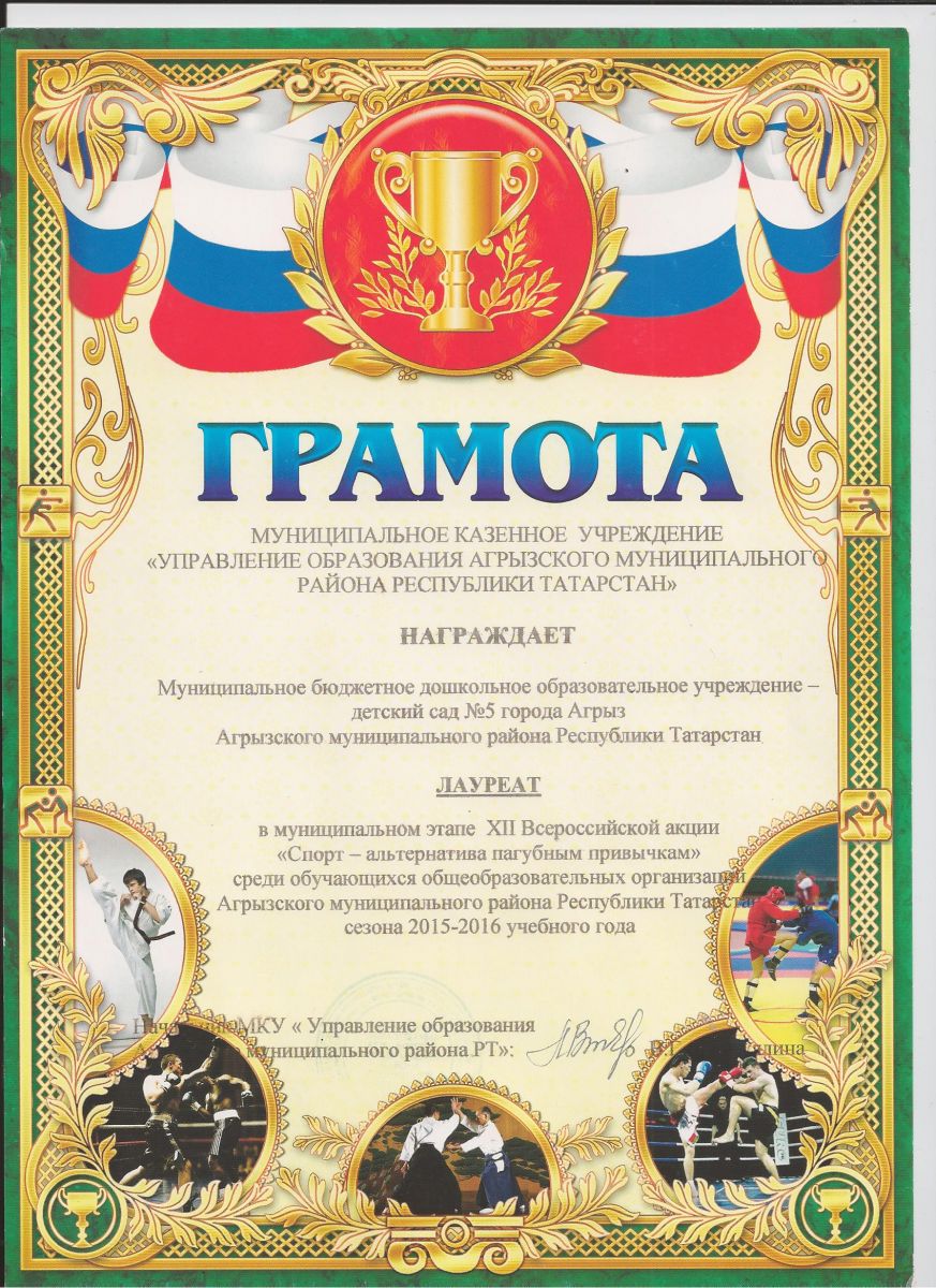 Лауреат муниципального этапа XII Всероссийской акции "Спорт - альтернатива пагубным привычкам", 2016 г.