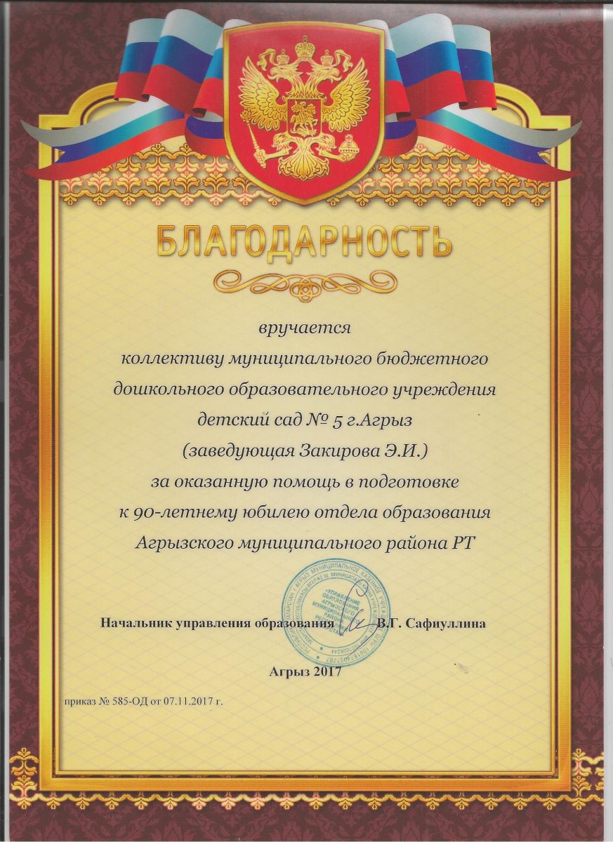 Благодарность коллективу, за оказанную помощь в подготовке к 90-летию юбилея отдела образования.