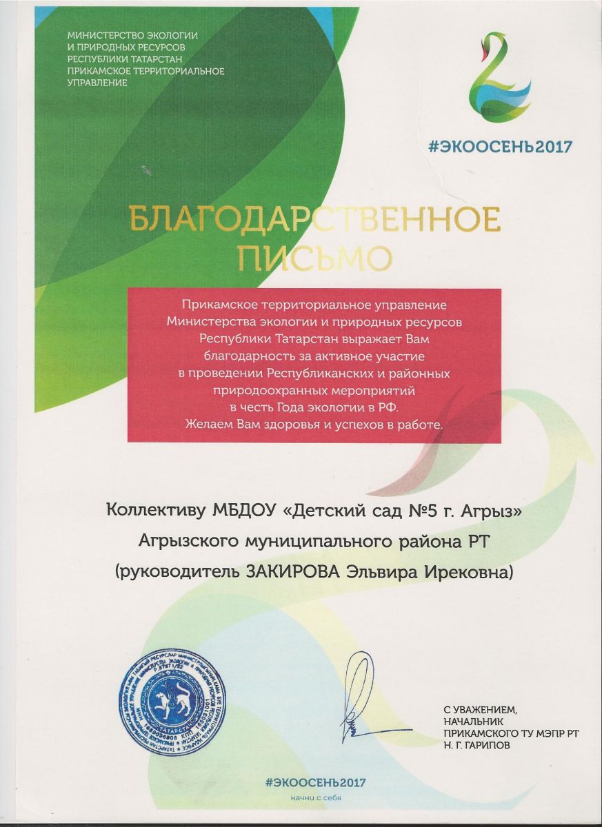 Благодарственное письмо Министерство экологии и природных ресурсов РТ, 2017 год