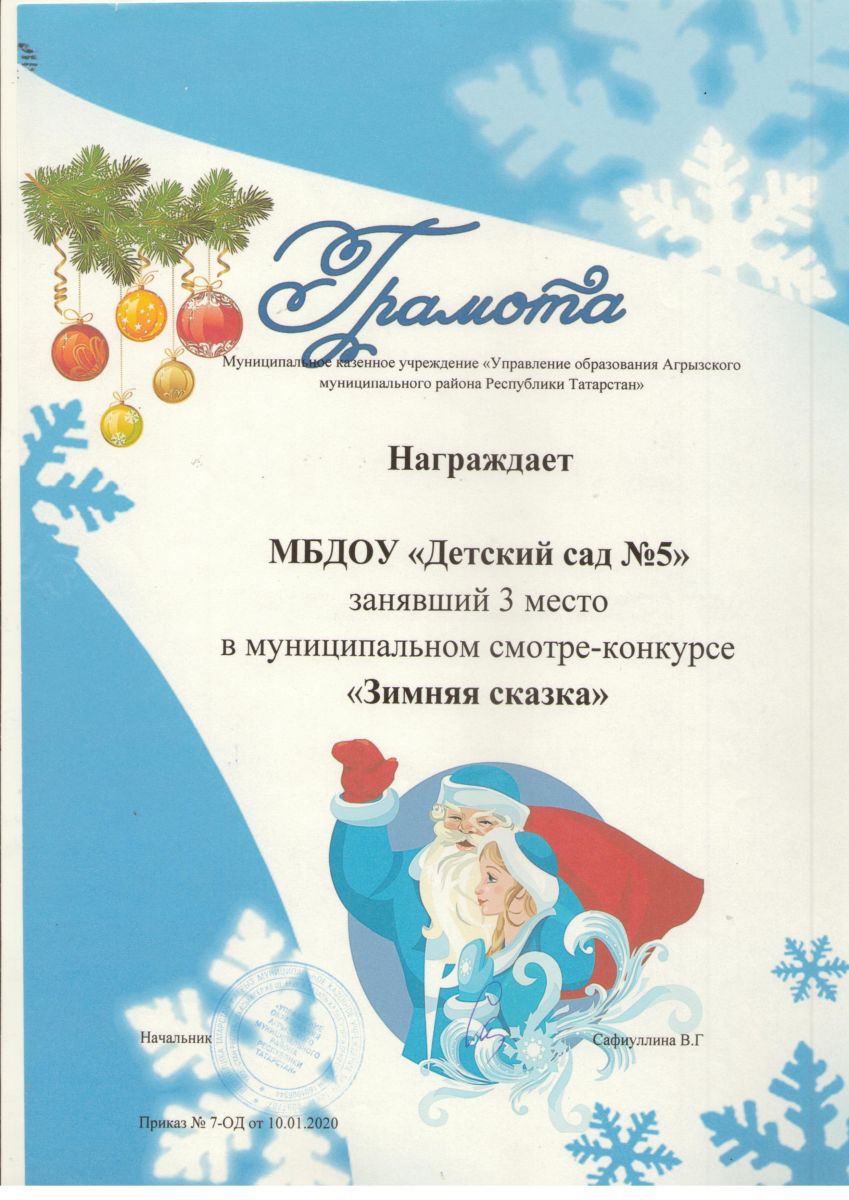 Грамота за 3 место муниципального смотра - конкурса "Зимняя сказка", 2019-2020 уч.год