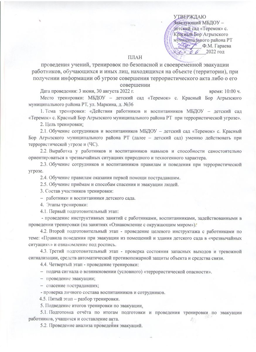 План проведения учений,тренировок по безопасной и своевременной эвакуации. jpg