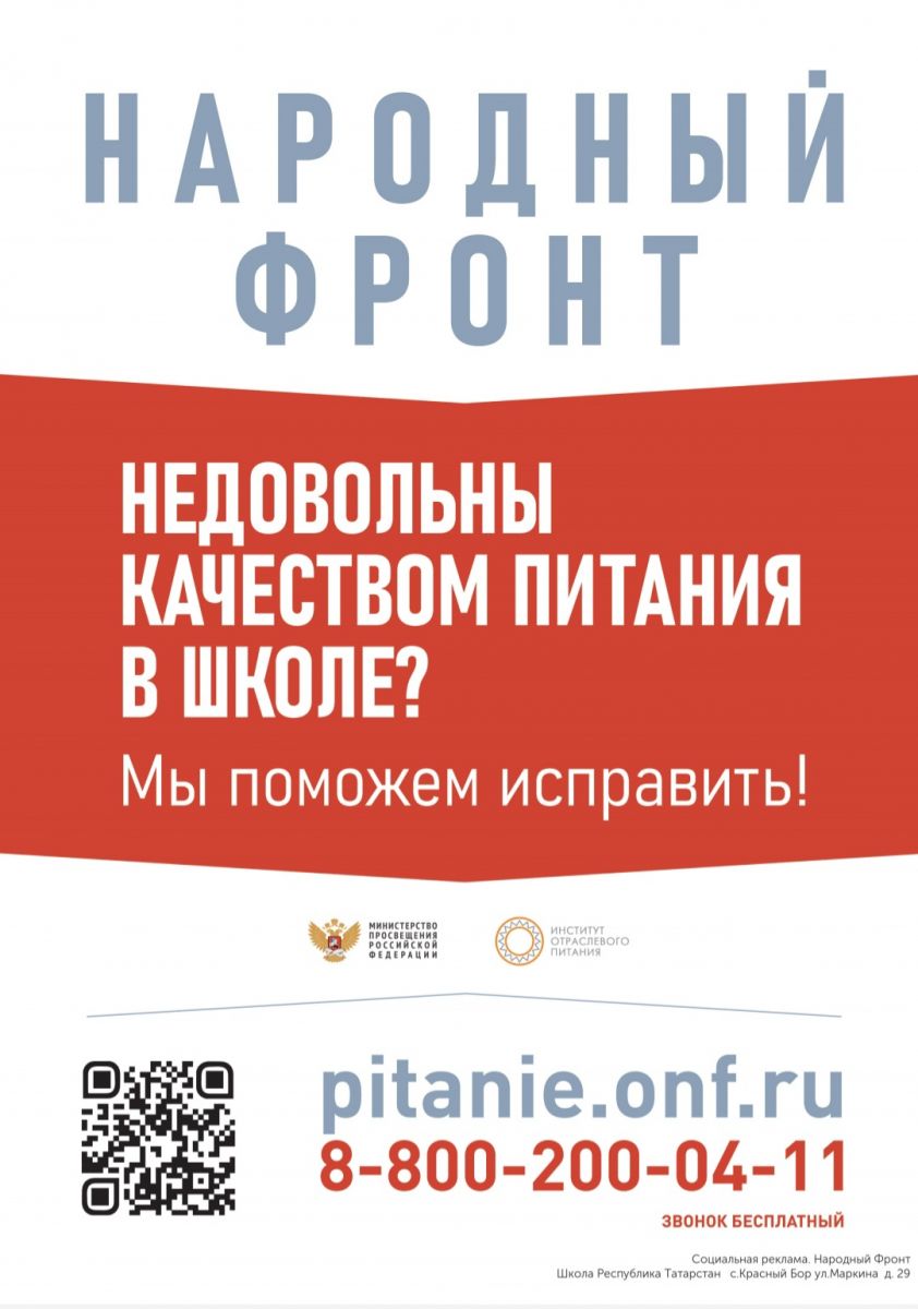 Школьное питание - один из ключевых проектов Народного фронта, так как мы признаем важность качественного питания в школе в общем здоровье и благополучии наших детей. Недовольны качеством питания в школе? Вы можете самостоятельно направить жалобы в ответственные ведомства. Сканируйте куар код и заполните форму.