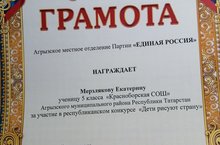 Мерзлякова Екатерина приняла участие в конкурсе "Дети рисуют страну", организованном Агрызским местным отделением партии "Единая Россия" и получила грамоту.
