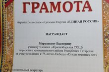 Мерзлякова Екатерина приняла участие в акции "Стихи военных лет", посвященной 75 летию Победы, организованной Агрызским местным отделением партии "Единая Россия" и получила грамоту.