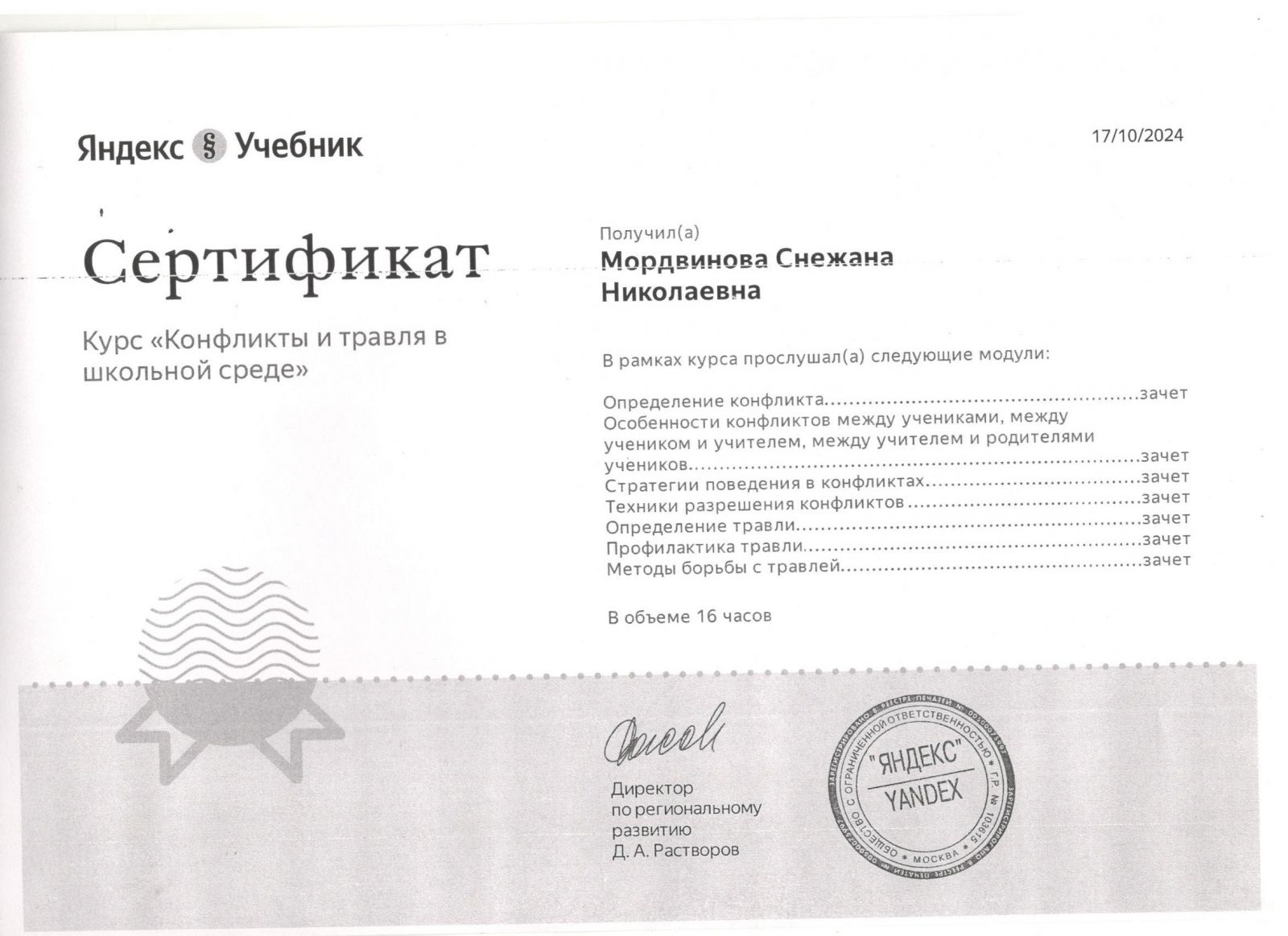 Сертификат курса "Конфликты и травля в школьной среде"