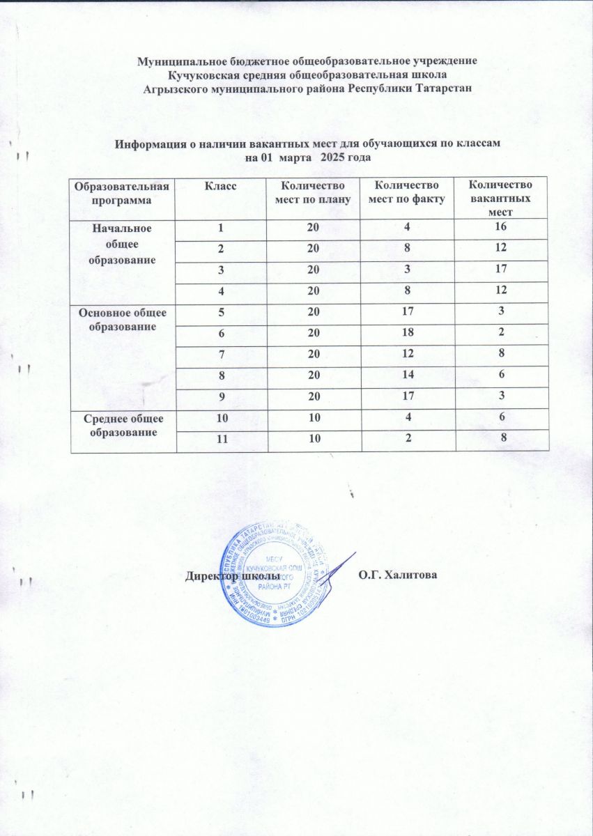 Информация о наличии вакантных мест для обучающихся школы на 01 июля 2025 года