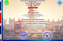 Поздравляем учащихся объединения "Увлекательный английский-1" и педагога дополнительного образования МБУ ДО ДДТ "Радуга талантов" Корневу Ирину Георгиевну с дипломом II степени V Международного конкурса "I speak English" . Желаем творческих успехов!