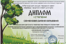 Дипломом I степени III Регионального конкурса творческих работ "Деревья -памятники живой культуры" награждена учащаяся объединения естественнонаучной направленности "В мире животных" Семенова Диана Юрьевна. Поздравляем Диану и руководителя педагога дополнительного образования Самуткину Елену Геннадьевну.