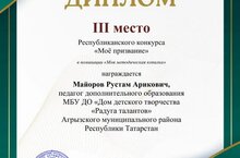 Поздравляем педагога дополнительного образования Майорова Р.А. с 3 местом в Республиканском конкурсе «Мое призвание» в номинации «Моя педагогическая копилка».