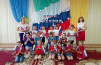 В перерывах коллектив детского сада показал детям шуточный номер «Оркестр», а детки исполнили патриотический танец с флагами.