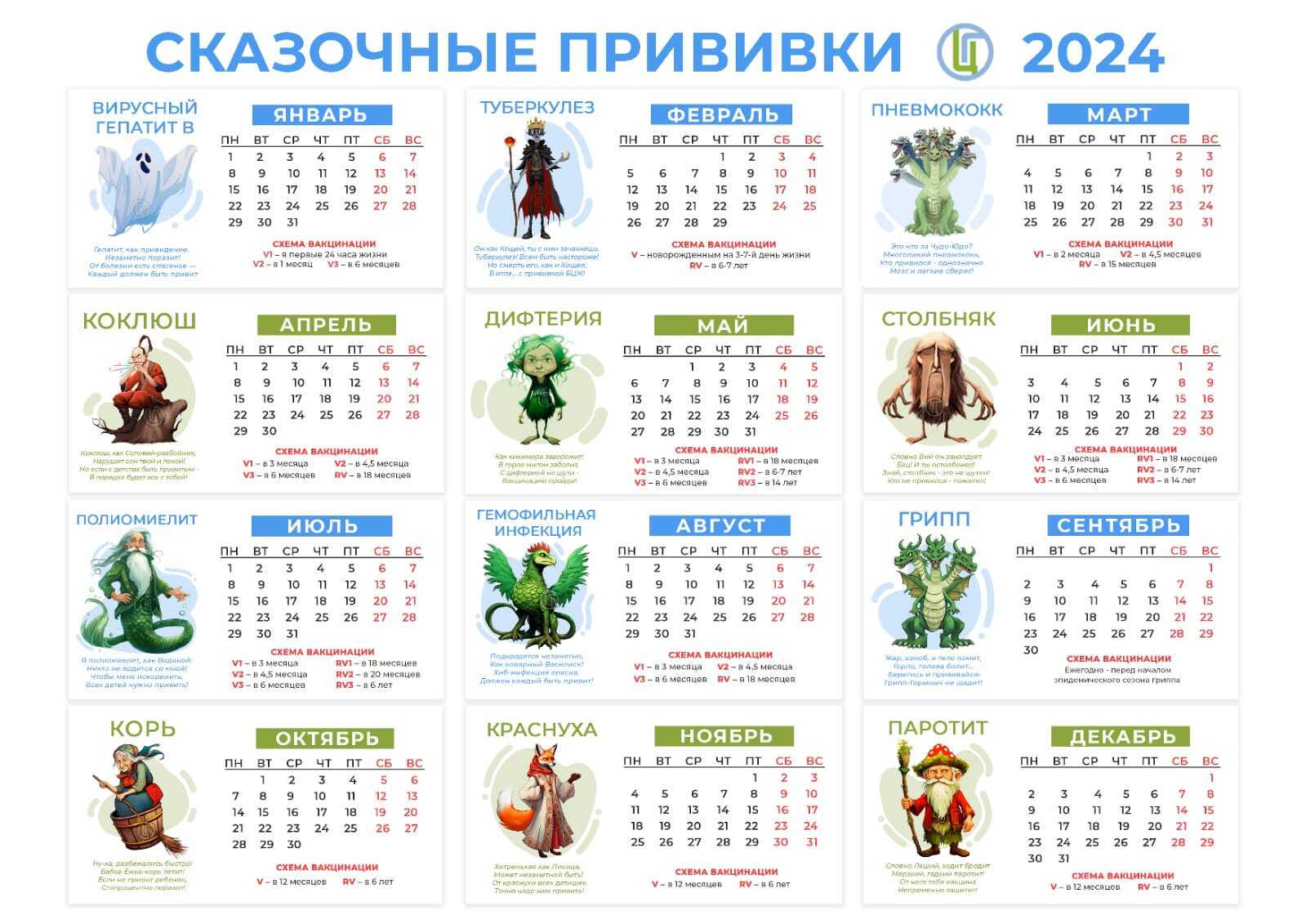 Территориальный отдел Управления Роспотребнадзора по Республике Татарстан (Татарстан) в Елабужском, Агрызском, Менделеевском районах с целью профилактики распространения инфекционной заболеваемости в организованных коллективах и в соответствии с постановлением Главного государственного санитарного врача Российской Федерации от 21.06.2023 № 9 направляет для работы календарь на 2024г. с профилактическими прививками. (нажмите на ссылку)
